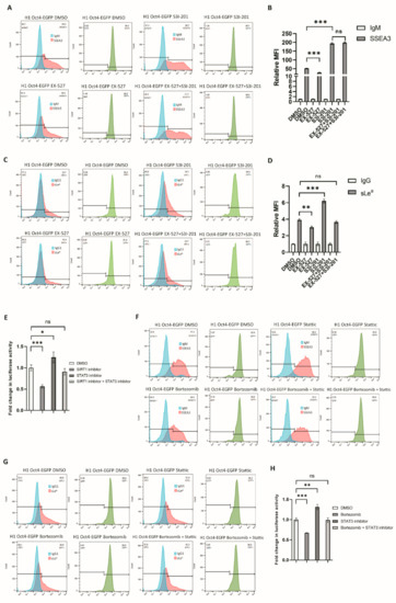 SSEA3 and sialyl Lewis a synthesis is altered by SIRT1 or STAT3 inhibitors. (A) Flow cytometry showing the levels of SSEA3 on H1 Oct4-EGFP cells after treatment with a SIRT1 or STAT3 inhibitor. All treated cells had similar GFP signal intensities under G418 selection. (B) The MFI of stained SSEA3 compared with the control. EX-527, a SIRT1 inhibitor, repressed SSEA3 synthesis in H1 Oct4-EGFP cells, and S3I-201, a STAT3 inhibitor, activated SSEA3 expression. EX-527-mediated repression of SSEA3 synthesis was reversed by S3I-201 (***, p < 0.001 and ns: not statistically significant). (C) Flow cytometry showing the levels of sialyl Lewis a on H1 Oct4-EGFP cells after treatment with a SIRT1 or STAT3 inhibitor. All treated cells had similar GFP signal intensities under G418 selection. (D) The MFI of stained sialyl Lewis a compared with the control. EX-527-mediated repression of sialyl Lewis a synthesis was reversed by S3I-201 (**, p < 0.01; ***, p < 0.001; and ns: not statistically significant). (E) EX-527 represses B3GALT5-LTR promoter activity in 2102Ep cells, and the EX-527-mediated repression of the B3GALT5-LTR promoter activity is reversed by S3I-201 (*, p < 0.05; ***, p < 0.001; and ns: not statistically significant). (F) Bortezomib represses SSEA3 synthesis in H1 Oct4-EGFP cells, and this repression is reversed by Stattic. (G) Bortezomib represses sialyl Lewis a synthesis in H1 Oct4-EGFP cells, and this repression is reversed by Stattic. (H) Bortezomib represses B3GALT5-LTR promoter activity in 2102Ep cells, and the Bortezomib-mediated repression of the B3GALT5-LTR promoter activity is reversed by Stattic (**, p < 0.01; ***, p < 0.001; and ns: not statistically significant).