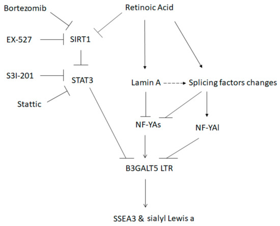 Taken together, our results indicate that the B3GALT5-LTR gene is highly expressed in ES cells, and according to our findings, it appears that B3GALT5-LTR expression is under the control of the lamin A-NFYA and SIRT1-STAT3 pathways in human EC and ES cells (Figure 7).