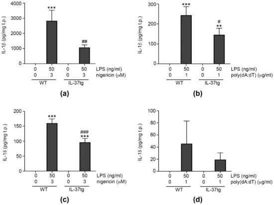 IL-1β and IL-18 can be produced by different inflammasomes [7,12], and we decided to investigate the effect of IL-37 on IL-1β and IL-18 production by the NLRP3 and/or AIM2 inflammasomes. To study endogenous IL-37 (thus assessing both its intra and extracellular effects [25,26]), we turned to mice transgenic for human IL-37 (IL-37tg) [25]. For inflammasome activation, we primed immortalized bone marrow-derived macrophages (iBMDM) from WT mice or IL-37tg mice with LPS, before providing a second, inflammasome-specific stimulus. As shown in Figure 1a, activation of the NLRP3 inflammasome with the well-characterized NLRP3 agonist nigericin [44] induced robust production of IL-1β in WT cells, whereas there was less IL-1β in IL-37tg macrophages. The difference in IL-1β between WT and IL-37tg macrophages was less pronounced, but still significant when the AIM2 inflammasome was activated with poly(dA:dT) (Figure 1b). Investigating IL-18, we found IL-37tg macrophages produced significantly less cytokine than their WT counterparts upon NLRP3 activation (Figure 1c). AIM2 activation only moderately increased IL-18 in both WT and IL-37tg macrophages; however, this increase was less pronounced in IL-37tg macrophages (difference not statistically significant, Figure 1d).