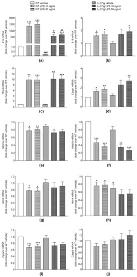 As shown in Figure 2, LPS stimulation for 3 h markedly increased Il1b expression (more than 1000-fold in macrophages from both strains when compared to their vehicle-treated counterparts, Figure 2a). Albeit at lower fold-changes, this was also the case for Il18 (up to 2-fold in both strains, Figure 2b), Nlrp3 (up to 10-fold, Figure 2c), and Casp1 (up to 2-fold, Figure 2d); however, LPS stimulation decreased the expression of Nlrp1a (up to −22% in WT and −19% in IL-37tg, Figure 2e) and Nlrp1b (up to −64% in WT and −66% in IL-37tg, Figure 2f). Furthermore, in WT macrophages, LPS moderately but significantly reduced the expression of Aim2 (up to −24%, Figure 2g), Nlrc4 (up to −24%, Figure 2h) and Pycard (up to −33%, Figure 2i), while IL-37tg macrophages only showed a non-significant trend towards reduction in these genes (up to −15%, −22%, and −25%, respectively, Figure 2g–i). The expression of Casp8 was not significantly affected by LPS stimulation in either WT or IL-37tg macrophages (Figure 2j). We also did not observe any difference in the expression of the genes investigated comparing 10 ng/mL with 50 ng/mL of LPS (Figure 2a–j).