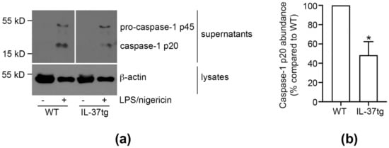 IL-37 inhibits caspase-1 activation. (a,b) WT or IL-37tg macrophages were stimulated with LPS (50 ng/mL) as indicated. After 4 h, nigericin (3 μM) was added for another 2 h. Control cells were treated with vehicle. Caspase-1 (pro-caspase-1 p45 and cleaved caspase-1 p20) and β-actin were assessed by immunoblot. Depicted is (a) one representative blot of three independent experiments (lanes irrelevant to this study were cut from the immunoblot images) and (b) the caspase-1 p20 signal intensity quantification normalized to β-actin. Caspase-1 p20 protein abundance is presented as change in caspase-1 p20 compared to WT (set as 100%) ± SEM. *, p < 0.05 for IL-37tg compared to WT. LPS: lipopolysaccharide, tg: transgenic, WT: wild-type.