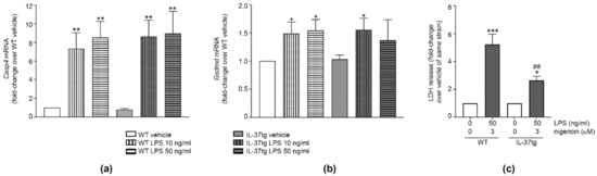 While treatment of iBMDM with different concentrations of LPS increased the expression of the mRNA encoding both caspase-11 (gene name Casp4, Figure 5a) and gasdermin D (Gsdmd, Figure 5b), we did not observe differences in these genes between WT and IL-37tg macrophages (Figure 5a,b). Stimulation with LPS/nigericin increased LDH release by both WT and IL-37tg macrophages. However, LPS/nigericin-stimulated IL-37tg macrophages released 50% less LDH than WT macrophages (Figure 5c). Thus, IL-37 inhibits pyroptosis independently of Casp4 or Gsdmd mRNA expression.