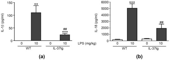 While IL-1β was undetectable in the plasma of vehicle-treated mice, we measured substantial amounts of IL-1β in the plasma of LPS-injected WT and IL-37tg animals. However, in comparison to LPS-injected WT mice, IL-37tg animals treated with LPS had 78% less plasma IL-1β (111 ± 27 pg/mL versus 24 ± 5 pg/mL, respectively; Figure 6a).