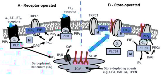 However, it is apparent that many cell types express SOCs with very different characteristics to Orai1-based CRACs such as much lower Ca2+ permeabilities, relatively linear or outward rectification, and considerably larger unitary conductances (see [13] for review on role of TRPC proteins in mediated SOCs). Given the properties of these SOCs, they are unlikely to be composed of Orai proteins. The molecular composition of these SOCs is controversial but there is increasing evidence that they are formed by the TRPC family of Ca2+-permeable non-selective cation channels (TRPC1–C7) [13]. These TRPC-based SOCs are likely to form a diverse group of channels with differing expression, properties, and functions since TRPC subunits form heterotetrameric structures [7,13]. There is further controversy over whether TRPC proteins form SOCs due to limited understanding, unlike with Orai proteins, of how store depletion couples to channel activation that is an essential requirement when defining SOCs. These issues are beginning to be unraveled by findings which suggest that store depletion activates TRPC-based SOCs through diverse STIM1-mediated processes including direct interactions between TRPC and Orai1 proteins, activation of Orai1-based CRACs as a prerequisite for TRPC1 opening, and direct interactions between TRPC and STIM1 [13,14]. For example, in overexpression studies it is proposed that direct interactions between STIM1 and TRPC channels govern activation [13,14,15,16,17,18], whereas elegant studies in salivary glands have shown that activation of TRPC1-based SOCs require prior activation of Orai1-based CRACs to induce insertion of TRPC1 subunits into the plasma membrane, with both activation of Orai1-based CRACs and TRPC1-based SOCs coupled to store depletion by STIM1 (see [19] for review on activation mechanisms of TRPC1-based SOCs in salivary glands). The studies highlighted in this review indicate that activation of STIM1-mediated TRPC1-based SOCs in native contractile VSMCs involves a Gq/PLCβ1 pathway and interactions between protein kinase C (PKC) activity and PIP2 which do not require Orai1.