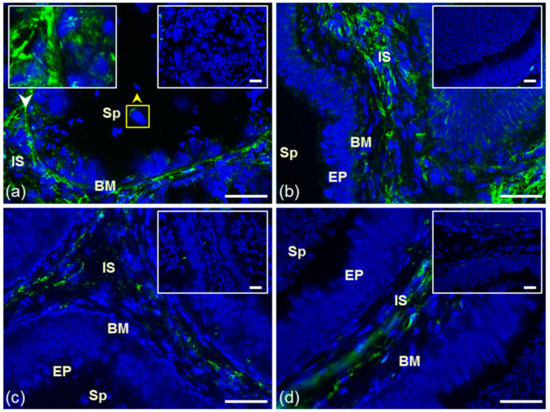 Polyclonal K-19 and H-300 antibodies were used to detect the presence and distribution of GPER1 in cryo-sections of bull testes and epididymis. In the testicular tissues, the K-19 antibody did not react (Figure 2a). Signal of the K-19 antibody was observed in interstitial tissue (IS) of all epididymal parts and in the membrane of secretory epithelial cells (EP) in the caput and cauda epididymal tubule (Figure 2b–d). The reaction with polyclonal antibody H-300 in bull reproductive tissues was negative (Figure S3).