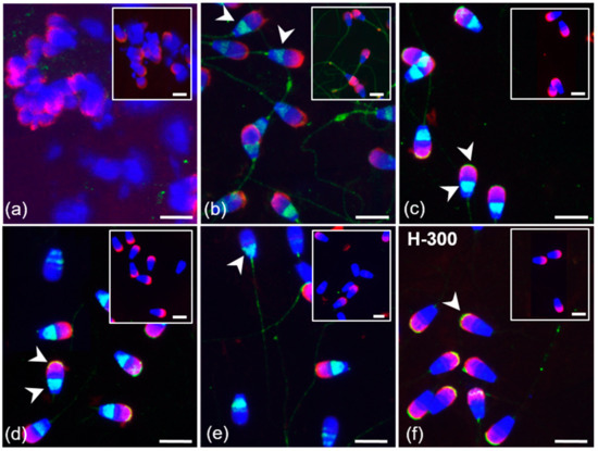 During the passage through the epididymis, the sperm surface is changed by the protein processing, removal and addition [76,77]. This is probably the reason why after ejaculation, an additional signal in the apical part of the acrosome was detected not only by the K-19 antibody but also H-300. While the majority of ejaculated spermatozoa were H-300 positive in the acrosome, K-19 labeled only a portion of the sperm population. This could be because the applied antibodies recognize different epitopes, or the plasma membrane was in a certain state.