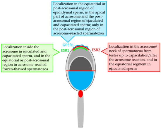 In recent years, new knowledge about the expression of classical ERs in human and pig spermatozoa has provided new insight into the relationship between estrogen action [55] and sperm development and function [47]. ESR1 and ESR2 were traditionally regarded as nuclear receptors that function as transcription factors. Then, Razandi et al. [87] reported that these ERs exist and function as plasma membrane receptors linked to G-protein [87]. The translocation of classical ERs to the plasma membrane is mediated by palmitoylation [16,79]. It has been suggested that the rapid signaling pathway is activated by estrogen through crosstalk between GPER1 and ESR1/2 [3,13,14]. The localization of ESR1, ESR2, and GPER1 within the acrosomal cap of bull spermatozoa seems to be a prerequisite for the possible co-operation between ERs involved in the events of the sperm lifetime.