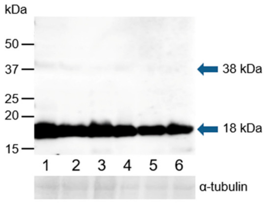 Western blot analysis was performed under reducing conditions using K-19 and H-300 antibodies to detect GPER1 in the protein extracts of epididymal, ejaculated, and capacitated spermatozoa as well as spermatozoa after the induction of the acrosome reaction. The K-19 antibody detected one strong band with a molecular mass of 18 kDa, and after longer exposure time, an additional weak band of 38 kDa was visible in all analyzed sperm extracts (Figure 11). The H-300 antibody did not show any reaction with sperm proteins (Figure S7).