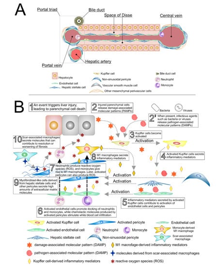 Interactions between inflammatory cells, perivascular cells, and endothelial cells at the onset and after a liver injury event. (A) Depiction of cells and structures in the liver under normal circumstances; (B) Sequence of events involved in the progression of various types of liver injury. Hepatocyte injury (1) causes release of damage-associated molecular patterns, DAMPs (2). These DAMPs lead to Kupffer cell activation (3) and consequent release of inflammatory mediators (4). Kupffer cells can also be activated by pathogen-associated molecular patterns (PAMPs) derived from pathogenic bacteria or viruses (2′). Inflammatory mediators secreted by activated Kupffer cells trigger activation of endothelial cells and perivascular cells (hepatic stellate cells and, to a lesser extent, non-sinusoidal pericytes) (5). DAMPs and PAMPs also contribute to the activation of endothelial cells and pericytes. Activated endothelial cells promote docking of circulating neutrophils and monocytes, which are stimulated to infiltrate into the tissue owing to the chemo-attractive inflammatory mediators present there (6). Neutrophils secrete reactive oxygen species, ROS (7), while infiltrating monocytes differentiate into proinflammatory (M1) macrophages, which secrete additional inflammatory mediators (8). In the presence of inflammatory mediators, hepatic stellate cells lose their morphological characteristics and, within a few days from the initial injury event, become proliferative cells that produce large amounts of collagen-rich extracellular matrix (ECM), which accumulate in the space of Disse (9) and hinder molecule exchange between the blood and the parenchyma. These cells, also known as myofibroblasts, also contribute to the generation of ROS, which causes further damage in hepatocytes and endothelial cells, and TGF-β, which contributes to modulation of the macrophage phenotype (see text for details). Finally, (10) macrophages that develop along this process (scar-associated macrophages) may take up phenotypes that secrete molecules that help revert fibrosis or may favor perpetuation of fibrosis. During this process, some activated pericytes may give rise to parenchymal cells (see text for details).