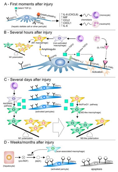 Molecular events mediating the interactions between inflammatory cells and perivascular cells soon after a liver injury event and thereafter. (A) Binding of DAMPs or PAMPs to toll-like receptor 4 (TLR4) increases secretion of a number of molecules that are chemotactic to neutrophils and monocytes, which favors their extravasation. (B) M1 macrophages develop from infiltrating monocytes, contributing to an M1 polarization. Neutrophils secrete interleukin 17A (IL-17A), while amphiregulin secreted by M1 macrophages leads to conversion of the latent form of TGF-β into its active form. Binding of IL-17A and TGF-β to their receptors triggers the activation of hepatic stellate cells and other pericytes. (C) Several days after the initial injury event, the number of activated pericytes increases, with consequent production of increased levels of active TGF-β. TGF-β promotes the acquisition of an M2-like phenotype by macrophages that have not acquired an effector phenotype, as well as by M1 macrophages. Macrophage polarization then shifts from M1 to M2-like. (D) During the weeks and months that follow, scar-associated macrophages develop and produce matrix metalloproteinase 7 (MMP7), which converts pro-nerve growth factor (pro-NGF) produced by hepatocytes into NGF. NGF binds to the low-affinity NGF receptor CD271, which is abundant on the surface of myofibroblast-like cells derived from activated pericytes and makes a number of these cells undergo apoptosis.