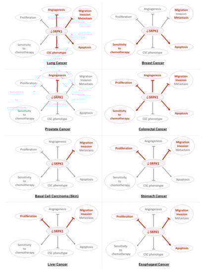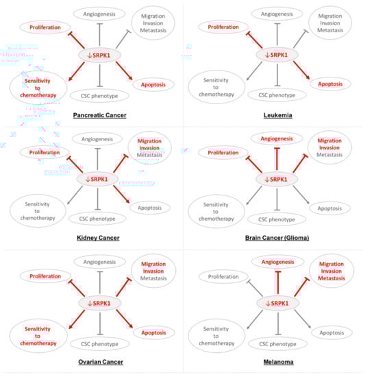 This figure shows the effect of serine-arginine protein kinase 1 downregulation (↓SRPK1) on distinct oncogenic processes, highlighting its potential role as a therapeutic target in various malignancies. Fourteen different cancer types are shown. Arrows and inhibition symbols represent promotion or suppression, respectively, of the pointed processes after SRPK1 downregulation in each one of the listed cancer types. Red color means the specific interaction between SRPK1 and the pointed process is discussed in the literature. Gray color could mean that the interaction is not described, described but not activated (e.g., ↓SRPK1 doesn’t involve proliferation, migration, and invasion in prostate cancer or proliferation in melanoma) or described with an opposite result in the literature (e.g., ↓SRPK1 enhances resistance, rather than sensitivity to chemotherapy in gliomas).