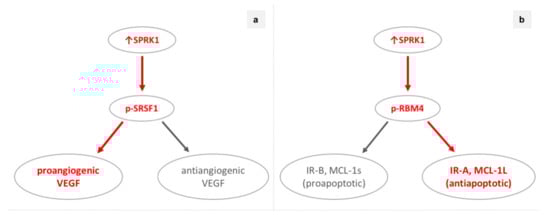 Likewise, SRPK1-driven alternative splicing is also vital in prostate carcinogenesis and particularly affects VEGF-induced angiogenesis. SRPK1 reduced expression—induced either through gene knockdown or the SRPK1 inhibitor SPHINX—suppressed angiogenesis thus tumor growth in vivo through a switch in VEGF alternative splicing. In particular, expression of the antiangiogenic VEGF165b splicing isoform was favored over the proangiogenic VEGF165. Of interest, SRPK1 downregulation did not alter other key oncogenic processes in vitro such as proliferation, migration, and invasion []. To summarize, targeting SRPK1 could treat prostate cancer by suppressing the VEGF-induced angiogenesis.