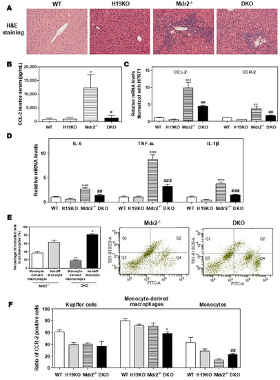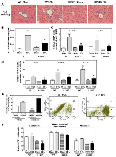 3.5. H19-Deficiency Ameliorates the Liver Cholestasis and Macrophage Activation in Both BDL and Mdr2-/- Mice