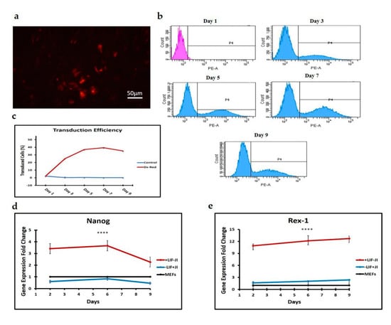 Transduction efficiency of MEFs using lentiviral vectors. To evaluate the efficiency of transduction, we utilized the fluorescence reporter gene Ds-Red and transduced MEFs as outlined in the materials and methods. (a) Transduced MEFs are fluorescent red under the microscope. Scale bar 50 μm. (b,c) Transgene expression reached a maximum on day 7 and maintained the signal up to day 9. (d,e) Upregulation of pluripotency gene expression in the presence of iPSC-inductive media (+LIF/−JI1), and trans-differentiation media (−LIF/+JI1). Nanog and Rex-1 are significantly upregulated 3-fold and 10-fold, respectively, in cells under iPSC reprogramming media. **** p < 0.0001.