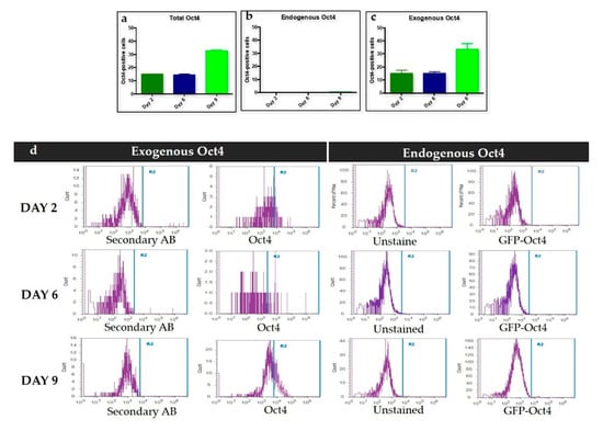 To confirm these results, we performed exogenous Oct4 assessment to determine the potential formation of iPSC intermediates (Figure 2). We correlated the levels of endogenous and exogenous Oct4 expression. MEFs used for trans-differentiation were isolated fromBL6 129S4-Pou5f1tm2Jae/J embryos, where the GFP gene expressed upon the activation of the Oct4 promoter. MEFs from this strain would fluoresce green if endogenous Oct4 was expressed []. Exogenous Oct4 expression was measured by staining cells with a monoclonal antibody that targeted Oct4 (Figure 2a–2c). Flow cytometry measured the number of positive cells for endogenous and exogenous Oct4 of the trans-differentiated MEFs on days 2, 6, and 9. There was no signal detection for the expression of endogenous Oct4 on days 2, 6, and 9. Exogenous Oct4 showed a signal starting on day 2 (Figure 2c). The exogenous Oct4 signal peaked on day 9 (Figure 2c). Levels of the retroviral signal followed Ds-Red levels (Figure 1). Lastly, the histogram log shift comparison among the exogenous Oct4 and endogenous Oct4 on days 2, 6, and 9 showed changes only on the exogenous Oct4 (Figure 2d). There was no endogenous Oct4 signal compared to the exogenous Oct4 signal starting on day 2.