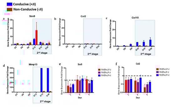 Effect of JI1 to the chondrogenic gene expression kinetics of transdifferentiated aggregates. Cells were transdifferentiated (day 2 to 36) under a conducive and non-conduce media. (a) Sox9 expression demonstrated its upregulation on day 12 (2nd stage) with later gene expression reduction toward the end of the process. Levels of expression were similar for both conditions. (b) Col2 expression was not upregulated in either condition at any time in the process. (c) Col10 was expressed at a higher level in cells under conducive media and expression levels increased with time. No Col10 expression under non-conducive media. (d) The Mmp13 gene was upregulated under conducive media on day 15, and this continued up to day 36. The Mmp13 gene was not present in non-conducive media. (e,f) MEFs do not undergo spontaneous chondrogenesis during the first stage of trans-differentiation either in the presence or absence of LIF or JI1. OSKM-transduced MEFs were cultured in three different conditions (−LIF/+JI1, −LIF/−JI1 and +LIFJI1) and samples on days 2, 6, and 9 were analyzed for Sox9 and Col2 gene expression. Both Sox9 and Col2 genes showed insignificant upregulation at all time points and conditions.
