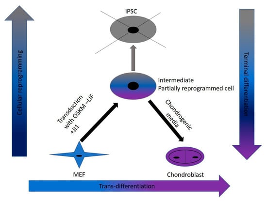 Trans-differentiation is a reprogramming process that uses lineage-specific transcription factors as a potentially faster and tumor-free alternative to iPSCs []. In this study, we aimed to find a safe and rapid method for generating chondroblasts. We performed the transduction of mouse embryonic fibroblasts (MEFs) with the well-known OSKM factors in the absence of LIF and with inhibition of the JAK-STAT pathway using the JAK inhibitor (JI1). This approach arrested iPSCs formation. It allowed for the partial opening of the chromatin enough for the second stage of the trans-differentiation process []. In the second stage, we exposed the cells to chondroblast differentiation media in the presence of growth factors (TGF-β and BMP2) that gave the cues for the cells to turn into chondroblasts for cartilage formation (Figure 7).
