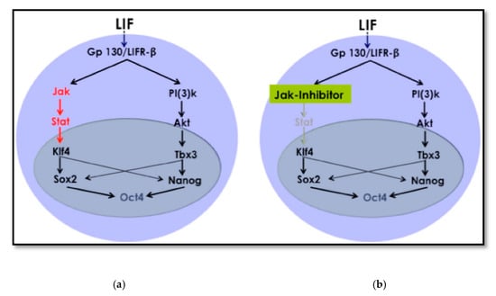 - Niwa, H.; Ogawa, K.; Shimosato, D.; Adachi, K. A parallel circuit of LIF signalling pathways maintains pluripotency of mouse ES cells. Nature 2009, 460, 118–122. [Google Scholar] [CrossRef]