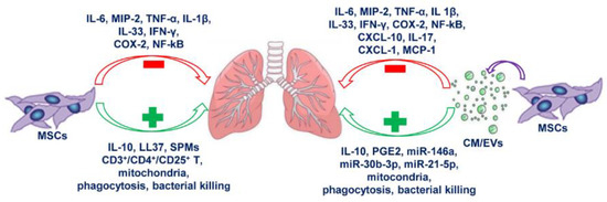 Anti-inflammatory effects of mesenchymal stem cells (MSCs) and secretome on lung inflammation. The scheme represents the main inflammatory mediators modulated by MSCs and secretome in lung diseases. The green color used for the boxes and the arrows indicate anti-inflammatory mediators and functions induced by MSCs and/or MSCs-derived conditioned medium (CM) or extracellular vesicles (EVs). The red color used for the boxes and the arrows indicate pro-inflammatory mediators and functions counteracted by MSCs and/or MSCs-derived CM or EVs. CXCL-1/CXCL-10: chemokine (C-X-C motif) ligand-1/ligand-10; COX-2: cyclooxygenase 2; IFN-γ: gamma interferon; LL37: antimicrobial peptide; MCP-1: monocyte chemoattractant protein 1; MIP-2: macrophage inflammatory protein 2; NF-κB: nuclear factor κB; PGE2: prostaglandin 2; SPMs: specialized pro-resolving lipid mediators; TNF-α: tumor necrosis factor alpha.