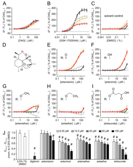 Artemisinin and 1-oleoyl-2-acetyl-sn-glycerol (OAG) were purchased from Sigma Aldrich (Munich, Germany). All other artemisinin derivatives (artemether, artenimol, arteether, and artesunate) were from Santa Cruz Biotechnology (Heidelberg, Germany). GSK1702934A and GSK-417651A were obtained from Tebubio (Offenbach, Germany), SAR7334 hydrochloride was from MedChemexpress (Monmouth Junction, NJ, U.S.A.), and CBN 2910-0498 and BTD were from ChemDiv (San Diego, CA, U.S.A.). All other reagents were of analytical grade.