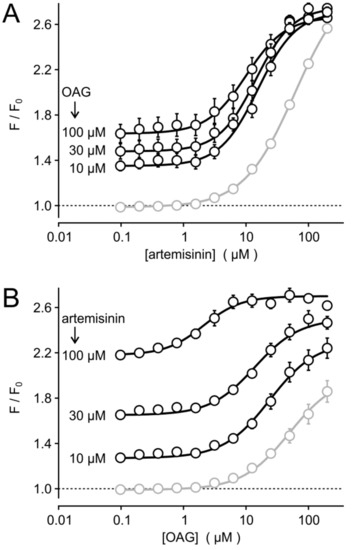 Effects of acute co-stimulation of HEKTRPC3-YFP cells with various concentrations of artemisinin and OAG. Fluo 4-loaded HEKTRPC3-YFP cell suspensions were assayed in a fluorescence imaging plate reader during acute co-application of serially diluted artemisinin without (grey symbols and lines) or with OAG added at the indicated fixed concentrations (A). (B) Similar experiment as in (A), but with serially diluted OAG in the absence or presence of the indicated fixed artemisinin concentrations. Data represent means and S.E. (n = 4 in two independent experiments).