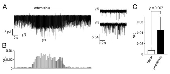 Channel activity induced by artemisinin in outside-out patches taken from HEKTRPC3-YFP cells. Outside-out patches were obtained from HEKTRPC3-YFP cells, and ionic currents were continuously recorded at a patch potential of –100 mV. Artemisinin (50 µM) was applied to the bath chamber as indicated by the bar (A, left). Short episodes before (1) and during application of artemisinin (2) are re-plotted at higher temporal resolution (right). Note that unitary current amplitudes are hardly discernible due to the very short channel opening events of TRPC3 channels. (B) The open probability (Po) for the unknown number N of channels in the patch of the experiment shown in (A) was calculated over 2 s bins and plotted at the same time scale. (C) Aggregated data (means and S.D.) of peak NPO values obtained as shown in (B) were obtained from 6 isolated outside-out patches before (basal) and during application of 50 µM artemisinin.