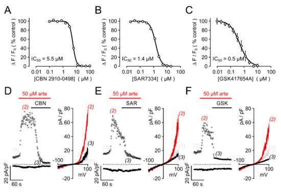 We next sought to investigate the effects of artemisinin on native TRPC3 channel complexes. In PC12 pheochromocytoma cells, expressions of TRPC3 and of tyrosine hydroxylase, a key enzyme to generate adrenergic neurotransmitters, were detectable by immunofluorescence (Figure 7A). Since anti-TRPC3 antibodies might suffer from a lack of specificity, we tested for functional responses of these cells to various established TRPC3 activators and artemisinin. In fura 2-loaded PC12 cells, significant increases in [Ca2+]i were triggered with the TRPC3/6/7-overarching activators OAG and GSK-1702934A, but also with 50 or 100 µM artemisinin (Figure 7B; 6–12 experiments for each compound). Electrophysiological recordings in PC12 cells confirmed the activator-induced and reversible increase in outwardly rectifying current densities with a reversal potential close to 0 mV (Figure 8). Further proof for the functional expression of endogenous TRPC3 channel-bearing complexes was obtained by testing the inhibitor sensitivity. Artemisinin-induced increases in [Ca2+]i in HEKTRPC3-YFP cells were sensitive to several recently published TRPC3 inhibitors, including CBN 2910-0498, SAR7334, or GSK417654A with IC50 values that were in the same range as those reported for TRPC3 activation by OAG (Figure 9A–C). In PC12 cells, ionic currents that were stimulated by 50 µM artemisinin were rapidly reversed by adding either 20 µM CBN 2910-0498, 10 µM SAR7334, or 10 µM GSK417654A (Figure 9D–F).