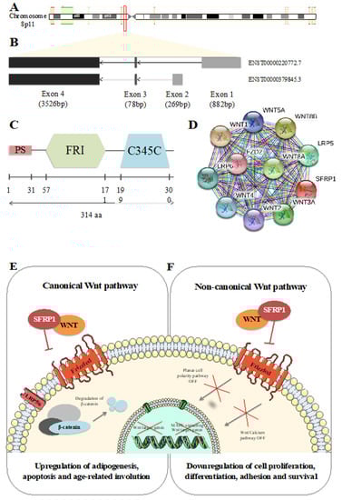 Secreted frizzled-related protein 1 (SFRP1) identity. (A) Schematic representation of SFRP1 position on chromosome 8. (B) Schematic representation of SFRP1 isoforms. (C) Schematic representation of SFRP1 protein domains. (D) Top 10 of protein–protein interactions between SFRP1 and Wnt signaling pathways. Figure drawn using Simple modular architecture research tool (SMART) [7]. Wnt canonical (E) and non-canonical (F) pathways in physiological context.