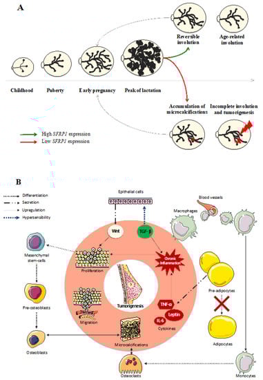 SFRP1 downregulation in breast tissue induces a chain reaction responsible for the malignant transformation of the cells. (A) Mammary glands evolve throughout a woman’s life until reaching their growth peak during breastfeeding. Afterwards, acinis remain useful, so the breast starts a reversible involution to destroy the excessive glandular and epithelial tissue. During the peri-menopausal step of a woman’s life, another involution appears to eliminate the rest of the useful tissue, decreasing at the same time the risk of breast cancer development. As a down-regulator of cell growth, SFRP1 under-expression could be responsible for the incomplete age-related breast involution resulting in a malignant transformation of the breast in the presence of microcalcifications. (B) The over-activation of the Wnt signaling pathway due to the SFRP1 down-regulation in breast tissue is responsible for the increasing proliferation and migration of mammary cells. The local inflammation needed to start the physiological age-related breast involution is responsible for the recruitment of the immune system. In the presence of microcalcifications, monocytes are able to differentiate in osteoclasts, while mesenchymal stem cells can differentiate in osteoblasts responsible for de novo microcalcifications formation. Furthermore, the replacement of epithelial tissue by adipose tissue needs pre-adipocytes maturation which is downregulated by the under-expression of SFRP1. The production of adipokines by immature adipocytes generates a chronic inflammation exacerbated by the hypersensitivity of epithelial cells to TGF- β due to the SFRP1 under-expression.
