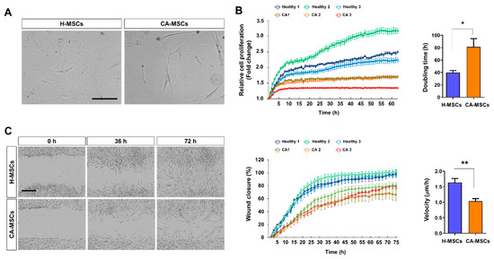 We first characterized morphological differences of mesenchymal stem cells (MSCs) derived from cerebellar ataxia patients (CA-MSCs) and healthy individuals (H-MSCs). MSCs were cultured for 24 h and imaged using phase-contrast microscopy (Figure 1A). CA-MSCs had a slender and less flattened morphology with fewer cell protrusions when compared with the findings of H-MSCs. Because of the importance of MSC proliferation and cell migration in therapeutic applications, such as culture expansion and homing [35], we analyzed the proliferative potential and migration capacity of MSCs. The proliferative potential of MSCs was evaluated by detecting the fold change of time-dependent cell density compared with the initial cell density, as well as cell doubling time. As indicated in Figure 1B, the proliferative capacity of CA-MSCs was lower than that of H-MSCs. Subsequently, we quantified the migration of MSCs using a scratch-wound healing assay (Figure 1C). The migration capacity and velocity of CA-MSCs were significantly decreased when compared with those of H-MSCs. These results demonstrate that the potential of proliferation and migration is lower in CA-MSCs than in H-MSCs.