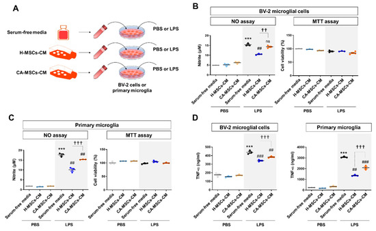 Anti-inflammatory and immunomodulatory activities of MSCs have been reported in vitro and in vivo. We compared the immunomodulatory effect of MSC-CM on glial activation (Figure 2A). BV-2 immortalized murine microglial cells, primary cultured microglial cells, and primary astrocytes were incubated with MSC-CM plus PBS or LPS (100 ng/mL) for 24 h. We observed a significant decrease in NO production in these cells when incubated with H-MSC-CM. However, CA-MSC-CM exhibited no effect or a less immunosuppressive effect than that of H-MSC-CM (Figure 2B,C; Figure S2). In addition, H-MSC-CM reduced LPS-induced TNF-α production in microglial cells, whereas CA-MSC-CM had a less suppressive effect than that of H-MSC-CM (Figure 2D).