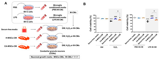 Characteristics of the neuroprotective potential of MSCs derived from CA-MSCs on oxidative stress or microglial toxicity. (A) Schematic drawing of the experimental procedure. The conditioned medium obtained from MSC culture was added with/without H2O2 (200 µM) or microglial conditioned medium (M-CM). M-CM was generated by BV-2 microglial cell culture stimulated with LPS (100 ng/mL) for 24 h. (B) Cell viability assay in cerebellar granule neurons (CGNs) was performed in triplicate. Cell viability was measured using the MTT assay. Results are presented as mean ± SEM obtained from MSC-CM from healthy subjects (n = 3) or CA patients (n = 3). One-way analysis of variance was followed by the Tukey post-hoc test. *** p < 0.001 vs. control; # p < 0.05, ### p < 0.001 vs. control + H2O2 or M-CM; † p < 0.05 vs. healthy MSC-CM + H2O2 or M-CM. ns, not significant. DW, distilled water.