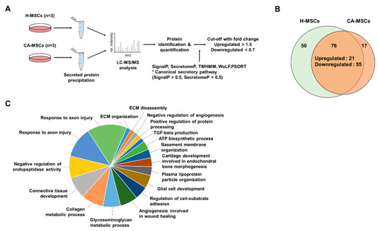 Characteristics of the secretome of MSCs derived from CA-MSCs. (A) Schematic drawing of the secretome analysis procedure. (B) Venn diagrams showing the number of identified proteins in the secretome of MSCs derived from healthy individuals (H-MSCs) and CA-MSCs. Overall, 50 proteins are exclusively identified in H-MSCs, 17 are identified in CA-MSCs, and 76 are identified in both MSCs. (C) Pie chart illustrates the functional analysis using the biological processes of the downregulated secretome in CA-MSCs.