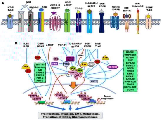 The contribution of signaling pathways that activate JAK/STAT3 signaling in cancer. Cytokines, growth factors, intracellular proteins, including non-receptor kinases (tyrosine or serine/threonine), can cooperate to induce the JAK/STAT3 signaling. (A) Various cytokines, peptide hormones, growth factors, and chemokines contribute to the activation of the JAK/STAT3 signaling to promote the progression of cancer. (B) The JAK/STAT3 signaling activated by tyrosine receptors and their cognate ligands, including neurotrophic receptors (TrkA, and TrkC), ILE/ILFR, PDGF-C/PDGFR, OSM/OSMR, CXCR12/CXCR7, HGF/c-MET, TGF-β/TGF receptors, IL-6/IL-6Rα/gp130, EGF/EGFR, Gastrin/GRPR, IGF/IGF1R, and Mk/Notch-1/2. Also, potential mechanisms by which tyrosine or serine/threonine kinases activate the JAK/STAT3 signaling through direct binding to JAK/STAT3 or indirect regulation of JAK/STAT3 activation. Once activated, phosphorylated and dimerized STAT3 enters the nucleus through importin-β1 and promotes the transcriptional expression of target genes to promote various cellular processes that are required for maintenance of survival in cancer.