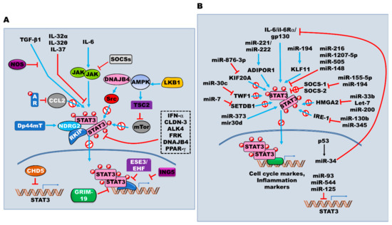 The regulation of the JAK/STAT3 signaling. (A) The multiple intrinsic proteins also involved in positive or negative regulation of JAK/STAT3 signaling with tyrosine receptors, their cognate ligands, and non-receptor kinases through ubiquitination, acetylation, regulation of STAT3 expression, regulation of STAT3 binding to the promoter of target genes, and direct physical interactions with STAT3. (B) MicroRNAs-mediated regulation of the JAK/STAT3 activation. In addition to being regulated by multiple oncogenes and suppressors, the expression and activation of JAK/STAT3 are directly or indirectly controlled by microRNAs, which are endogenous small non-coding RNAs that function to the regulation of gene expression at transcriptional or post-transcriptional levels.