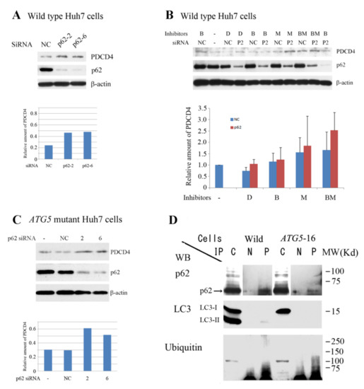 Figure 6 shows that the knockdown of p62 upregulated PDCD4 with both SQSTM1-2 and SQSTM1-6 siRNAs, indicating that p62 was involved in PDCD4 degradation. The PDCD4 protein levels in the p62 knockdown cells were slightly increased in the presence of the proteasome inhibitor MG132 but was not prominently increased in the presence of the lysozyme inhibitor bafilomycin A1, and the PDCD4 protein levels were increased even more in the presence of both reagents (Figure 6B). These results are consistent with the notion that PDCD4 protein may be degraded by both autophagy and proteasome systems after ubiquitination. In the ATG5 mutant cells, p62 silencing also upregulated the PDCD4 protein levels, as shown in Figure 6C. This suggests that PDCD4 may be degraded by the autophagy system in the mutant cells as well as in the wild-type Huh7 cells.