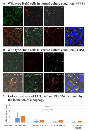 Next, to determine whether or not p62-ubiquitinated PDCD4 complex transfers to autophagosomes, the colocalization of p62, PDCD4, and LC3 was investigated by immunocytochemistry using Huh7 cells. As shown in Figure 7, particles of the autophagosome marker LC3 were formed constitutively in the normal culture of Huh7 cells and increased in number and size when starved by serum removal and the colocalization of PDCD4, p62, and LC3 was observed under both normal and starved conditions (Figure 7A). The colocalization areas in the particles were slightly larger in the starved cells than in the normal culture cells (Figure 7B,C). These results indicated that autophagy was constitutively activated in Huh7 cells, which was consistent with the results of Western blotting showing that the autophagy inhibitors bafilomycin A1 and 3-MA upregulated PDCD4 levels under normal culture condition. The number and size of the colocalized particles were increased in the presence of bafilomycin A1 and/or MG132 (Figure S3A).