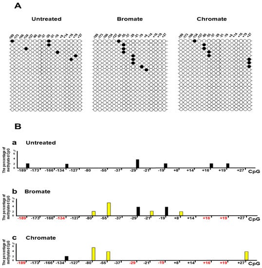 Oxidative DNA damage modulates the DNA methylation pattern of the promoter and transcribed regions of the breast cancer 1 (BRCA1) gene in cells: HEK293H cells were treated with bromate or chromate, as described in the Materials and Methods section. Subsequently, genomic DNA was isolated from the cells and subject to bisulfite sequencing. (A) Representative results of the DNA methylation pattern of the BRCA1 promoter and transcribed regions (−189 to +27) are illustrated. The panel on the left indicates the results of the untreated cells. The panel in the middle represents the results from the cells treated with 5 mM bromate for 24 h with recovery for 48 h. The panel on the right illustrates the results from the cells treated with 10 μM chromate for 24 h with recovery for 48 h. (B) The percentage of methylated CpGs: Panels a, b, and c illustrate the percentage of methylated CpGs in the promoter and transcribed regions of BRCA1 gene in the untreated cells, cells treated with 5 mM bromate for 24 h with 48 h recovery, and cells treated with 10 μM chromate for 24 h with 48 h recovery, respectively. The bars in yellow indicate the new DNA methylation sites induced by bromate or chromate. The percentage of methylated CpGs was calculated from the DNA sequencing results from at least 50 colonies.