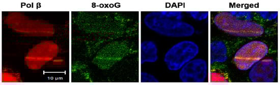 To further determine whether bromate- and chromate-induced oxidative DNA damage resulted in the loss of 5mCs, mutations, and new methylation sites at the BRCA1 gene through pol β during BER, we initially analyzed the recruitment of pol β to the oxidized DNA bases, 8-oxoGs that can be induced by bromate and chromate. HEK293H cells transfected with a plasmid expressing mCherry-tagged human pol β were micro-irradiated to create 8-oxoGs. Pol β-mCherry was recruited to the same nuclear DNA damage site stained for 8-oxoGs with an anti-8-oxoG antibody (green) (Figure 3). This suggests that pol β-mCherry was recruited to 8-oxoGs in cells (Figure 3).