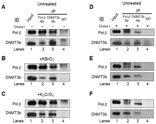 Pol β interacts with DNMT3b in cells. Co-IP and immunoblotting (IB) of pol β or DNMT3b in cell lysates was performed without (A–C) and with (D–F) DNase I digestion as described in the Materials and Methods section: The lysates were prepared from the untreated HEK293H cells (A,D) or cells treated with 5 mM bromate (B,E) or 10 μM chromate (C,F) for 2 h. Cell lysates were subject to co-IP and IB for pol β and DNMT3b, as described in the Materials and Methods section. Lane 1 corresponds to the whole lysates of the untreated cells designated as the “Input” control. Lanes 2 and 3 correspond to cell lysates immunoprecipitated with an anti-pol β and an anti-DNMT3b antibody, respectively. Lane 4 is the cell lysates immunoprecipitated with rabbit IgG alone. IP represents an immunoprecipitation; IB indicates immunoblotting. Experiments were done in triplicate.
