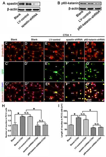 3.5. Spastin or p60-Katanin Knockdown Reverses the Positive Effect of CT04 on Neurite Outgrowth