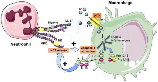 Cathelicidin LL-37 is an antimicrobial peptide released within NETs and was previously recognized to induce IL-1β from monocytes following the activation of the P2X purinoreceptor 7 (P2X7R) [78], that mediates the potassium efflux during inflammasome activation (Figure 3). Kahlenberg et al. reported some interesting findings on the role played by NETs in triggering the NLRP3 inflammasome activation in macrophages of patients with systemic lupus erythematosus (SLE) [79]. Indeed, they found a positive correlation between the concentration of LL-37 within NETs and their ability to activate the NLRP3 inflammasome and release IL-1β and IL-18 through caspase-1. As well, LL-37 played a major role in potassium efflux through the P2X7R activation. A central role for IL-18 was shown, which effectively stimulated NET release at the same extent of other known NETosis stimuli (i.e., PMA and LPS) [79]. Additionally, IL-18-stimulated NET release significantly increased caspase-1 activation in primed macrophages compared to IL-18 alone. This might suggest a feed-forward loop through which NETs increase the synthesis of IL-1β and IL-18 in macrophages, that in turn can stimulate NET formation in neutrophils (Figure 3). Similarly to what happens in SLE, the pivotal role of NETs was demonstrated in acute gout, too [80]. As well, patients with adult-onset Still’s disease (AOSD) presented with higher levels of circulating NETs compared to controls, which contributed to the NLRP3 inflammasome and macrophage activation, finally increasing the release of pro-inflammatory cytokines [81]. An interplay between NETs and the inflammasome has been described also in severe asthma [82]. Among patients included in the Severe Asthma Research Program (SARP)-3, increased caspase-1 concentrations were measured in patients with high levels of NETs, thus suggesting the inflammasome activation. This may suggest that patients with severe asthma have a marked neutrophil activation in their airways, as proved by the increased concentrations of NETs, the latter being able to further trigger the inflammasome in monocytes or macrophages and release IL-1β [82,83].