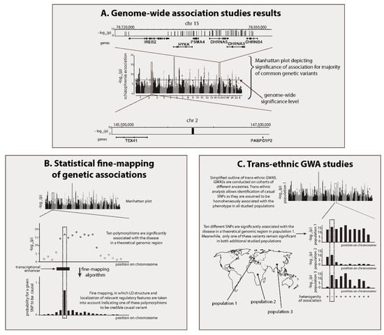 Another population-genetic tool that can be used to narrow down the pool of potential causal variants is trans-ethnic GWAS (Figure 1C) []. The first significant success of GWAS for schizophrenia was achieved in a Caucasian cohort [,]. Causal variants of schizophrenia are common, which means that, given the universality of disease genetic determinants, the genome regions associated with schizophrenia in other populations should significantly overlap with those identified in Caucasians. At the same time, the LD blocks in other populations have different structures, resulting in only partial overlap between groups of variants associated with schizophrenia in populations with different ancestry, even within the same genomic regions. This intersection of variant sets represents a list of polymorphisms that are genetically linked to the regional causal variant in all analysed populations, and this list will inevitably be shorter than the list of all associated polymorphisms for each population. A GWAS recently conducted by the PGC in an East Asian population has confirmed the effectiveness of this strategy for schizophrenia []. A high correlation between the factors that determine genetic predispositions to the disease in European and East Asian populations allowed the two data sets to be merged. A joint analysis showed that trans-ethnic studies can be used to refine association mapping. The approach was also successful in a recent trans-ethnic GWAS that was performed in populations of Latino and African ancestry [].