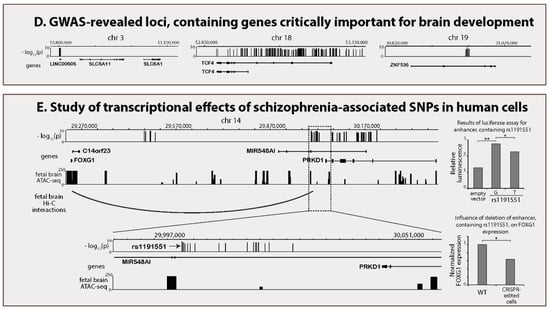 Results of recent schizophrenia genome-wide association studies (GWASs) and basic methods for identification of schizophrenia genes. (A) Manhattan plot for recent schizophrenia GWAS meta-analysis []. Many GWAS regions cover several genes. However, some of them are located in intergenic DNA. Two representative GWAS regions are zoomed in: significantly associated polymorphisms are depicted as vertical bars. (B) Statistical fine-mapping of genetic associations. Each polymorphism’s probability to be causal is assessed in this type of analysis. Additional epigenetic information can improve prediction accuracy. Idealized fine-mapping of GWAS region is depicted. Only one of 10 genome-wide significant polymorphisms (highlighted in dashed rectangle) appears to be credible causal variant. (C) Trans-ethnic GWAS. Trans-ethnic study including human populations of three different ancestries is represented. Picture shows one of 10 variants from an idealized GWAS region as consistently (non-heterogeneously) associated with the phenotype. It is assumed that such variants are likely to be causal. (D) Study of highly penetrant mutations with brain-related phenotypes. Genes, identified using three different approaches of this class as being schizophrenia genes, are represented. Whole-exome sequencing (WES) studies indicated that rare mutations in SLC6A1 cause schizophrenia []. This strongly suggests that expression of SLC6A1 is regulated by schizophrenia-associated common variants as one of GWAS regions is located in close vicinity to this gene (200 kb upstream). Rare Mendelian syndrome with psychiatric symptoms confirms role of TCF4 in schizophrenia development. Various disruptive mutations in this gene lead to dominant autosomal Pitt-Hopkins syndrome, characterized in particular by epilepsy and mental retardation []. Finally, phenotypes of model animals with deliberately knocked-out genes identified ZNF536 as being one of the schizophrenia genes. ZNF536 double-knockout zebrafish line shows behavioural and neuroanatomical (decreased forebrain volume) changes []. (E) Description of transcriptional effects of common variation in human neuronal cells. Converging lines of evidence obtained using these methods indicate that FOXG1 is likely to be regulated by a schizophrenia causal variant. Study of spatial chromatin organization in human fetal brain revealed that one of the schizophrenia GWAS regions interacts with the promoter of FOXG1 located 750 kb from it []. Subsequent study showed that FOXG1-interacting SNP rs1191551 is close to one of the fetal brain ATAC-seq peaks []. Functional test (luciferase assay) demonstrated enhancer activity of genomic fragment, harbouring rs1191551. Furthermore, this activity was dependent on genotype. The role of this region in regulation of FOXG1 was additionally confirmed by CRISPR-Cas9 deletion of 500 bp surrounding rs1191551 in neural progenitor cells, with the latter leading to a significant decrease in expression of FOXG1 but not any other nearby gene.