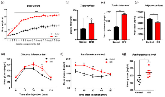 Eight-week-old male mice were divided into two groups (n = 12/group): the mice belonging to one of the groups were fed the NCD for 24 weeks, and the other mice were fed the HFD for 24 weeks to induce obesity. The body weights of the mice and other key parameters related to obesity and insulin resistance were measured during the 24-week feeding period. The control mice, which were fed the NCD, exhibited a constant body weight gain over the 24-week period, whereas the HFD-fed mice showed a significantly higher body weight gain and increased weight gains in peripheral organs, including the liver; however, we observed no marked changes in the kidney and spleen (Figure 1a, Figure S1c). We also found that HFD-fed mice showed significantly increased plasma triglyceride, cholesterol, and significantly lower adiponectin levels compared with their respective control mice (Figure 1b–d). Other studies have shown that high-fat-diet-induced obesity in mice exhibited lower glucose and insulin tolerance versus normal-diet mice [48]. Similarly, the HFD-fed mice showed a significant decrease in insulin sensitivity, as demonstrated by the GTT and ITT results (Figure 1e,f). Interestingly, the NCD (control diet) alone was unable to induce glucose intolerance (Figure 1g). These findings indicate that the chronic consumption of HFD caused increased body weight gains and significant metabolic perturbations that have profound impacts on insulin sensitivity, as reflected by the impaired GTT and ITT results.