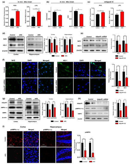 It has been demonstrated that consumption of a high-calorie diet intake enhanced oxidative stress in several tissues, including brain tissue [34,49]. Similarly, others also demonstrated that consumption of HFD significantly reduced the protein expression level of hemeoxygenase-1 (HO-1) and nuclear factor-2 erythroid-2 (Nrf-2) in HFD–fed mice brains [28]. In order to determine whether consumption of the HFD for 24 weeks mediate oxidative stress, for this purpose, we quantified oxidative stress in terms of ROS/LPO and GSH/GSSG assays both in vitro and in vivo. Our results of ROS and LPO assays indicated that chronic consumption of HFD significantly increased ROS/LPO level in mice brain (Figure 2a). Similarly, we also examined the glutathione (GSH and GSSG) levels and found that consumption of the HFD for 24 weeks significantly reduced the cellular GSH content and the GSH/GSSG ratio in the mouse brains compared with the levels found in the NCD-fed mouse brains (Figure 2b). Moreover, our Western blot results showed a significant reduction in the protein expression level of Nrf-2 and HO-1 in both cortex and hippocampus regions of HFD-fed mice brain (Figure 2d). To ascertain these results of oxidative stress in relation to the possible involvement of AdipoR1. We knockdown adipoR1 in embryonic mouse hippocampal cell line mHippoE-14 by using by Sure Silencing Mouse ApidoR1 shRNA plasmid. Similar to our In vivo findings, we found that adipoR1 knockdown also increased ROS/LPO level and reduced expression of Nrf-2/HO-1 proteins levels, as indicated by immunoblot analysis (Figure 2c,e). Furthermore, our immunofluorescence results also showed significant reductions in the immunoreactivity of Nrf-2/HO-1 protein levels in AdipoR1 knockdown cells ((Figure 2f). From these results, we can conclude that the chronic consumption of HFD-induced oxidative stress by down-regulating the antioxidant defense systems via adipoR1 in HFD-fed mice brains.