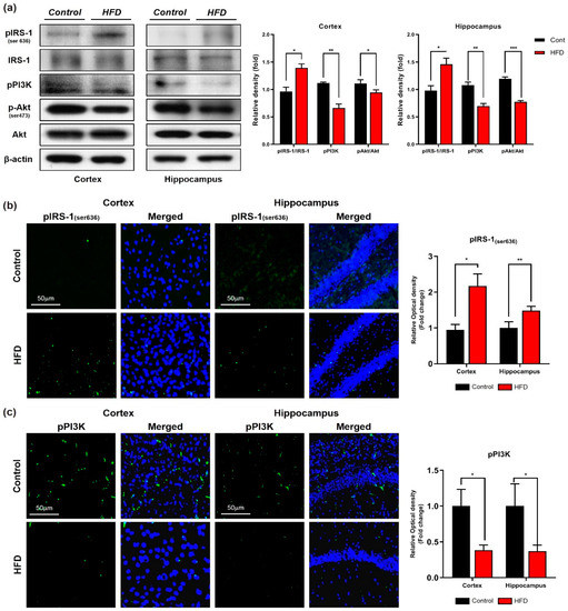 Furthermore, other studies have reported that obesity increased central insulin resistance in overweight subjects in comparison with lean subjects [52]. Therefore, to further evaluate the molecular mechanism underlying the HFD-induced brain insulin resistance, we investigated the insulin signaling pathway through Western blotting and immunostaining analyses. Our immunoblot and immunofluorescence results revealed that the expression and immunoreactivity of IRS-1 phosphorylated at serine residue 616 was significantly increased in the cortex and hippocampus of the HFD-fed mice in comparison with the control mice (Figure 3a,b), and this increase was followed by decreases in the levels of phospho-PI3K and phospho-Akt in both the cortex and hippocampus region of the HFD-mice group (Figure 3a,c). Taken together, these findings indicated that HFD-induced oxidative stress mediates neuronal insulin resistance by impairing adipoR1/p-AMPK signaling both in vivo and in vitro.