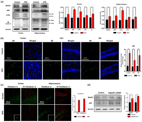 Mounting evidence suggests that obesity, diabetes, and AD are linked through the disruption of neuronal insulin signaling [54,55]. In AD, APP is enzymatically cleaved by β-secretase (BACE) and then by γ-secretase, leading to Aβ production. Senile plaques and neurofibrillary tangles (NFTs) are two well-known and extensively studied hallmarks of AD that decrease synaptic plasticity [56]. Therefore, Western blot and confocal microscopy analyses of the cortex and hippocampus of both groups of mice were performed to assess the effect of the HFD on amyloid pathology. Our western blot results indicated that the expression level of APP and APP-CTFβ (APP C-terminal fragment indicating β-site cleavage of APP) was upregulated both in vivo and in vitro (Figure 5a,d). Consistent with these findings, we found that the expression level of BACE1 was increased in the HFD group compared with the control group (Figure 5a). In addition, our western blot results also indicated that knockdown of AdipoR1 in an embryonic mouse hippocampal cell line mHippoE-14 increased BACE1 level (Figure 5d). Moreover, we found increased expression and immunoreactivity of Aβ as detected in the brains of the HFD-fed mice via both immune blot and immunofluorescence, indicating that the consumption of an HFD induces signs of amyloid pathology (Figure 5a,b). Likewise, we examined the brains of both the NCD- and HFD-fed mice through thioflavin staining. The results indicated that the HFD significantly increased Aβ aggregation and deposition in the mouse brain in both indicated regions (cortex and hippocampus) and induced early signs of amyloid pathology, as evident from the minor accumulation of deposited amyloid senile plaques (SPs) (Figure 5b,c). Notably, our findings demonstrate that chronic consumption of HFD promotes BACE1-mediated APP cleavage and Aβ peptide generation and aggregation, resulting in signs of Aβ-containing SP deposition in the early stage of AD.