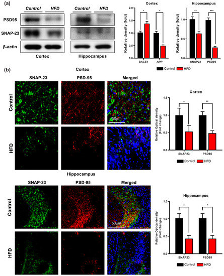 Several studies have indicated that HFD has a substantial effect on a postsynaptic marker (drebrin, PSD-95) [57] and presynaptic proteins (synaptophysin, syntaxin, and SNAP-25) [14], leading to hippocampal long-term potentiation impairment [56,57,58]. Therefore, to determine the effect of HFD-induced synaptic loss, we investigated the pre- and postsynaptic protein levels in both groups through Western blotting analysis. As depicted in Figure 6a, the expression level of PSD-95 was significantly decreased in both the cortex and hippocampus of the HFD-fed group in comparison with the control group. A presynaptic protein marker (synaptosomal-associated protein 23 (SNAP-23) that plays a vital role in synaptic plasticity [59] was also analyzed through Western blot analysis.