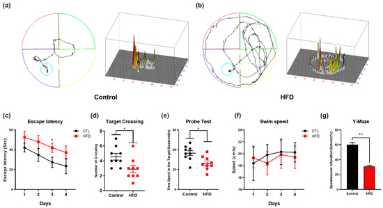 To evaluate the impact of the HFD on cognitive performance, we performed behavioral analyses, including the MWM and Y-maze tests. The MWM test is the most reliable and noninvasive test for determining cognitive changes in the AD mouse model [60]. Accordingly, we used the MWM and Y-maze tests to assess the effect of the HFD on memory impairment. First, we recorded the learning ability of the mice (n = 12 mice/group) during the training session in the MWM test. We observed that the HFD-fed mice showed more latency time in seconds to reach the hidden platform in comparison with control mice (Figure 7c). We also examined the mean swim speeds during the training days in order to observe the motor ability between HFD-fed mice and NCD-fed mice. We found no significant difference in swim speed measurements between HFD-fed mice and NCD-fed mice, indicating that any differences in ability to reach the hidden platform were irrelevant to the motor functions of the mice (Figure 7f). Next, after completion of the training session, we removed the hidden platform, and performed a probe test. The results of the probe test showed that the control mice fed with NCD spent more time in the target quadrant and exhibited a higher number of platform crossings, whereas the HFD-fed mice not only spent less time in the target quadrant but also exhibited few platform crossings (Figure 7d,e). This finding shows that the chronic consumption of HFD induces memory impairment. Following the MWM test, we evaluated the spontaneous alteration behavior percentage of the mice (n = 12 mice/group) by evaluating the average total number of arm entries and successive triplets using a Y-maze test. The spontaneous alternation behavior provides an indication of spatial working memory, which is a type of short-term memory. After the feeding period, the percentage of spontaneous alternation behavior of the HFD-fed mice was lower than that of the control mice, which suggests that the HFD is responsible for the observed decline in cognition (Figure 7g).